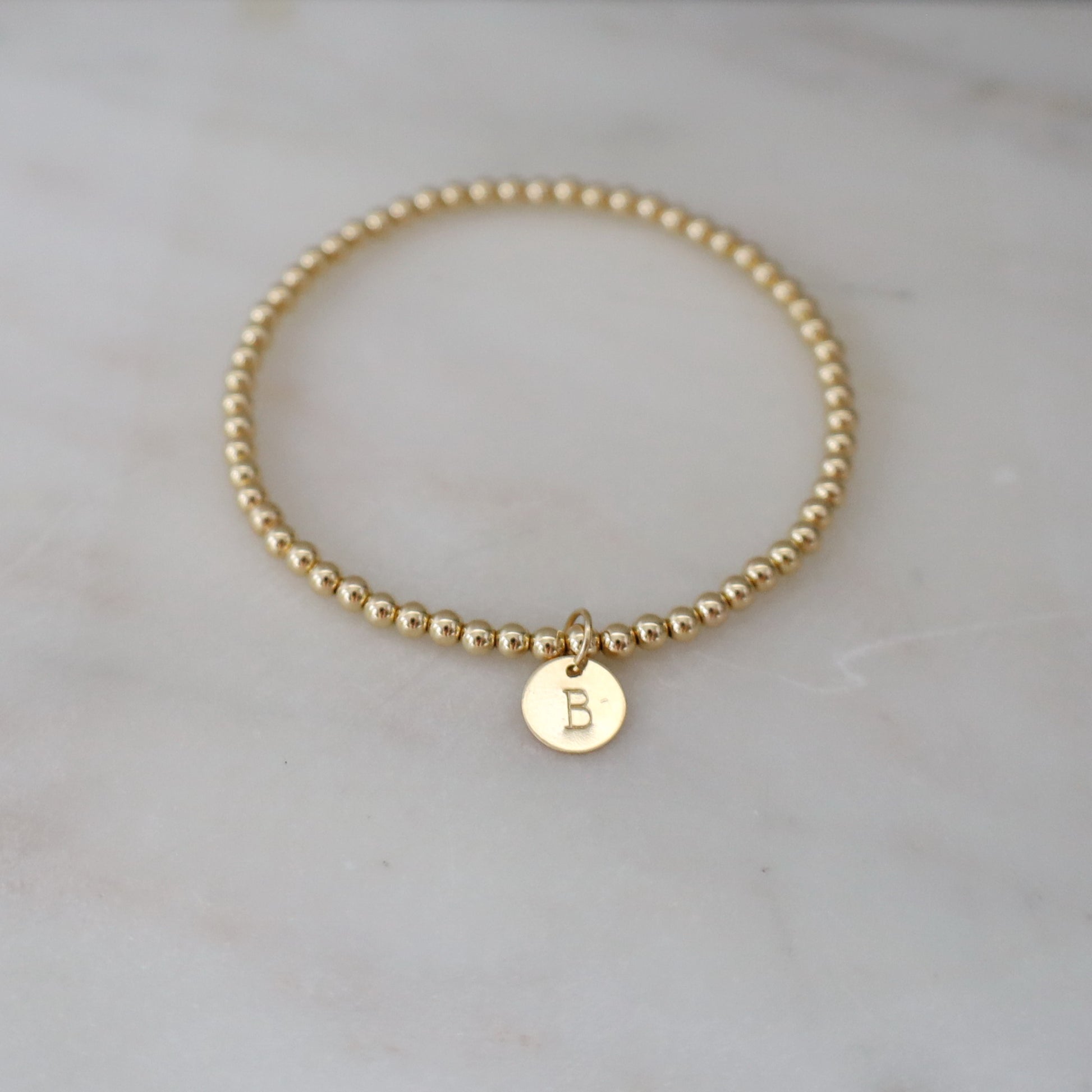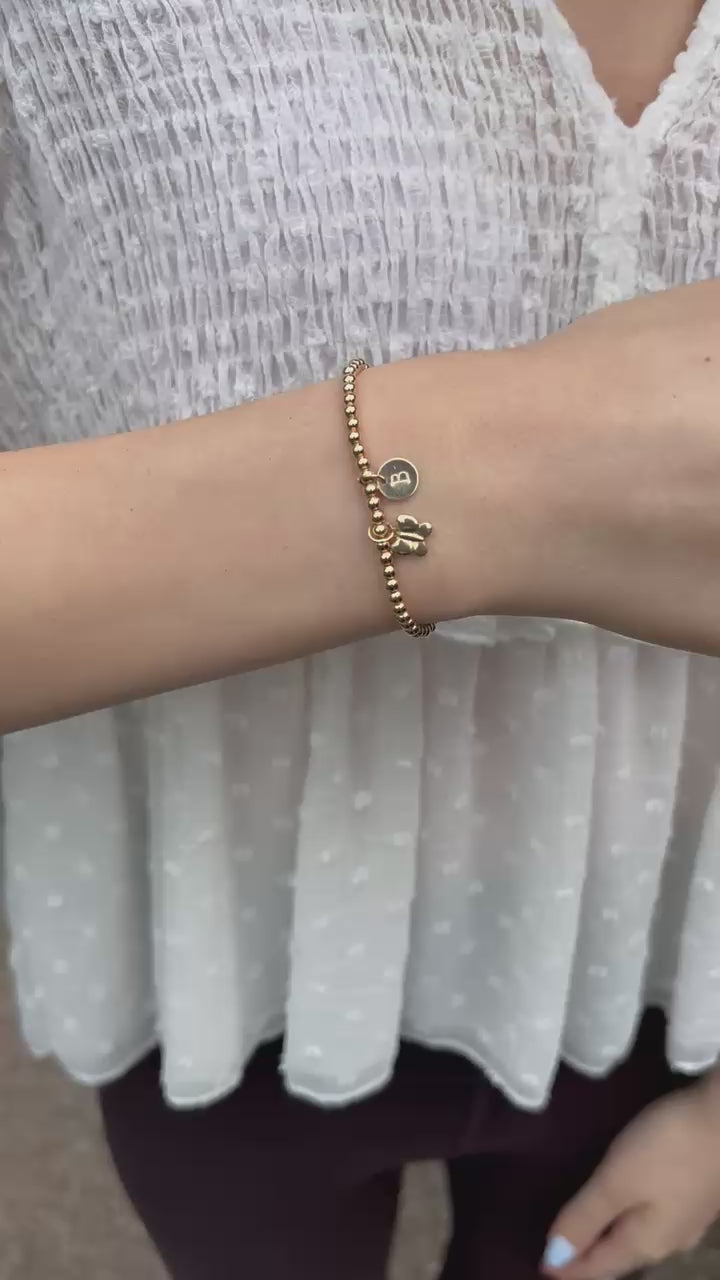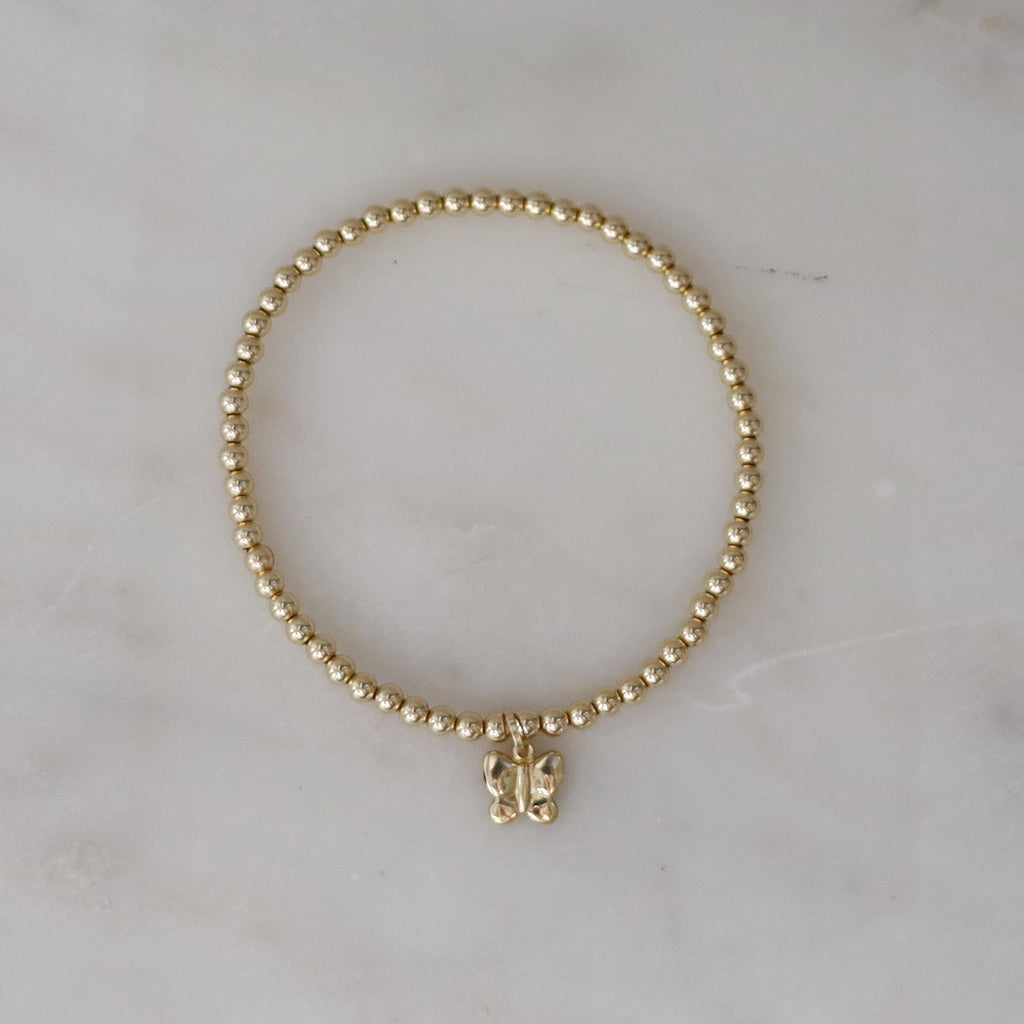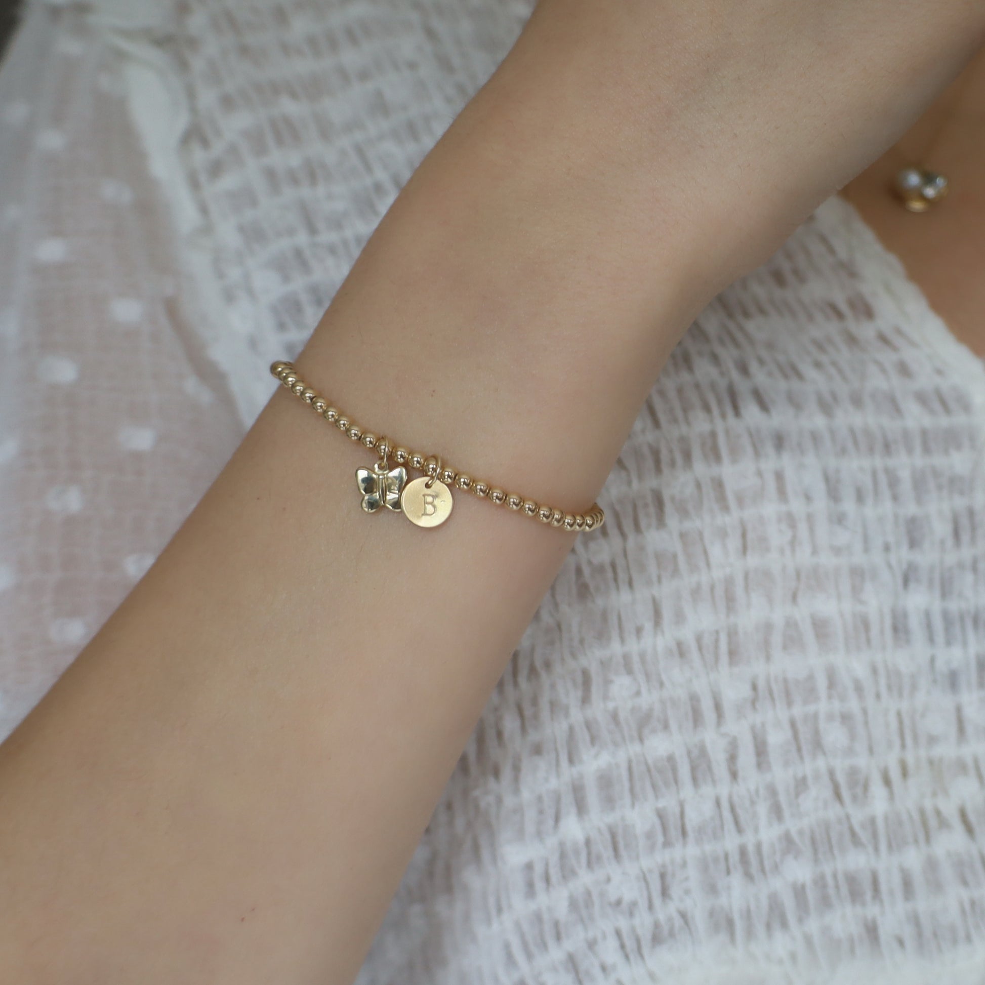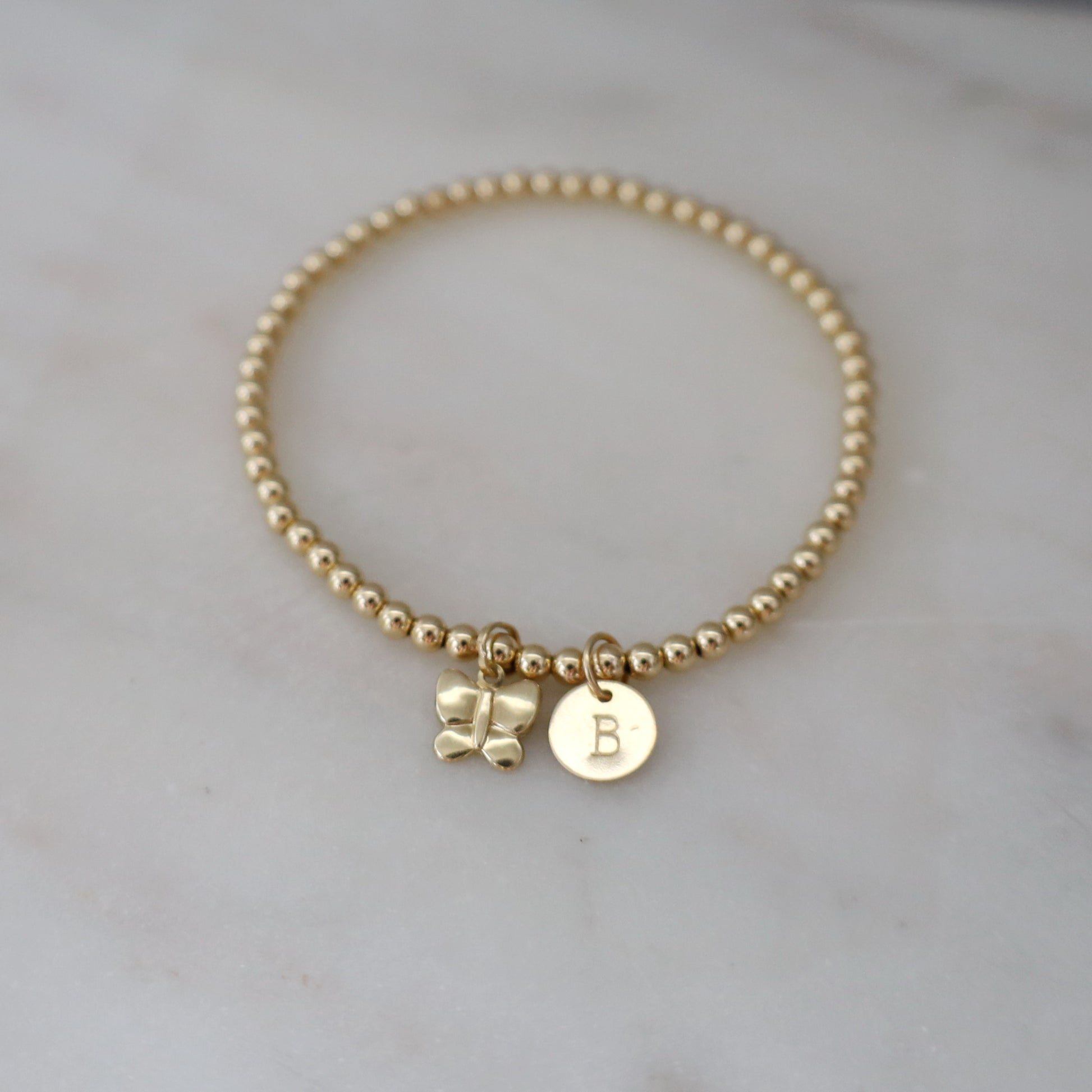 Made with 3mm 14K Gold beads. This bracelet is also available without the Butterfly and/or the initial disc.