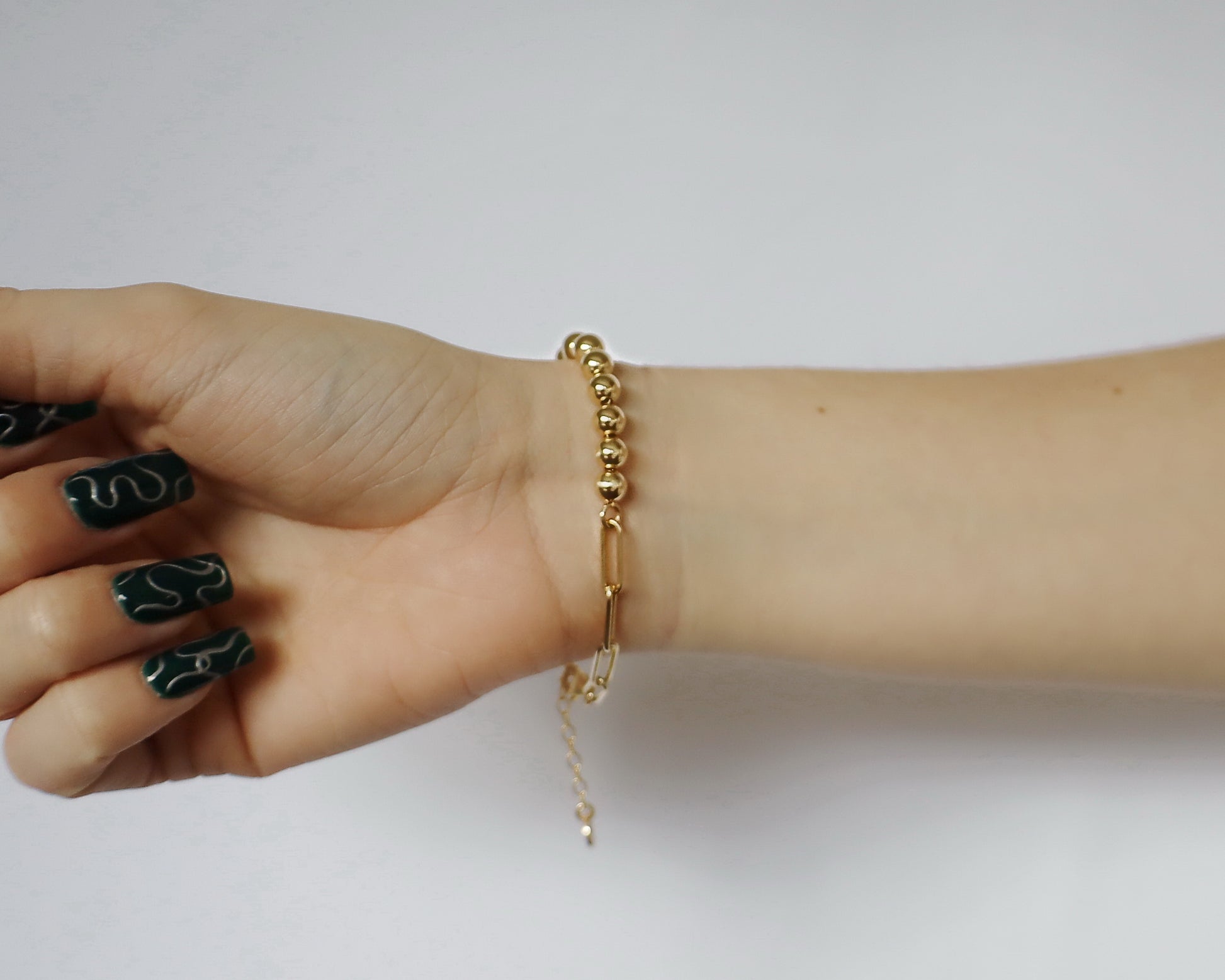 This beautiful bracelet is made with a mix of 6mm beads and a paper clip chain.