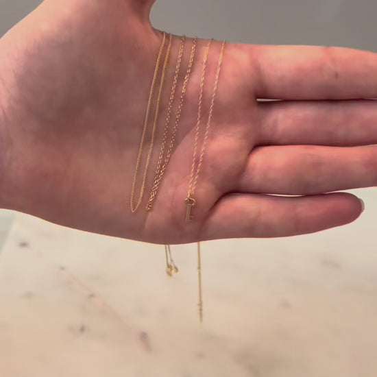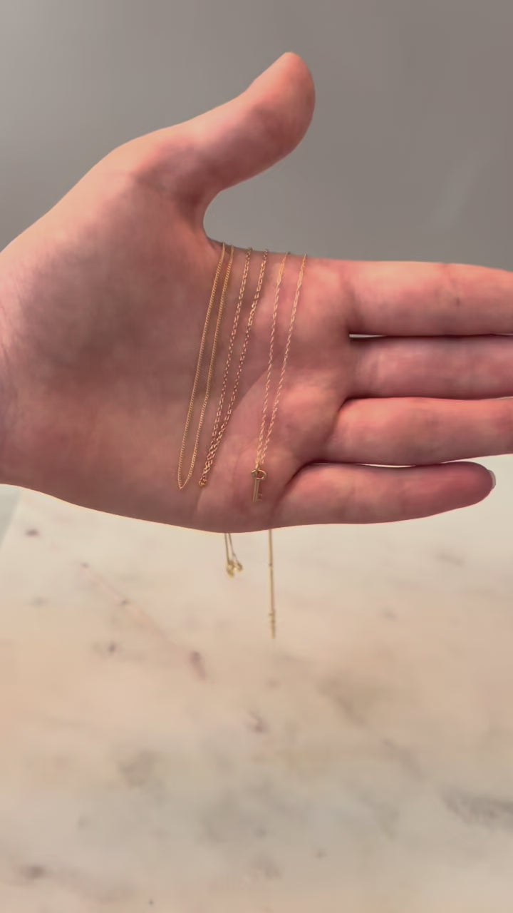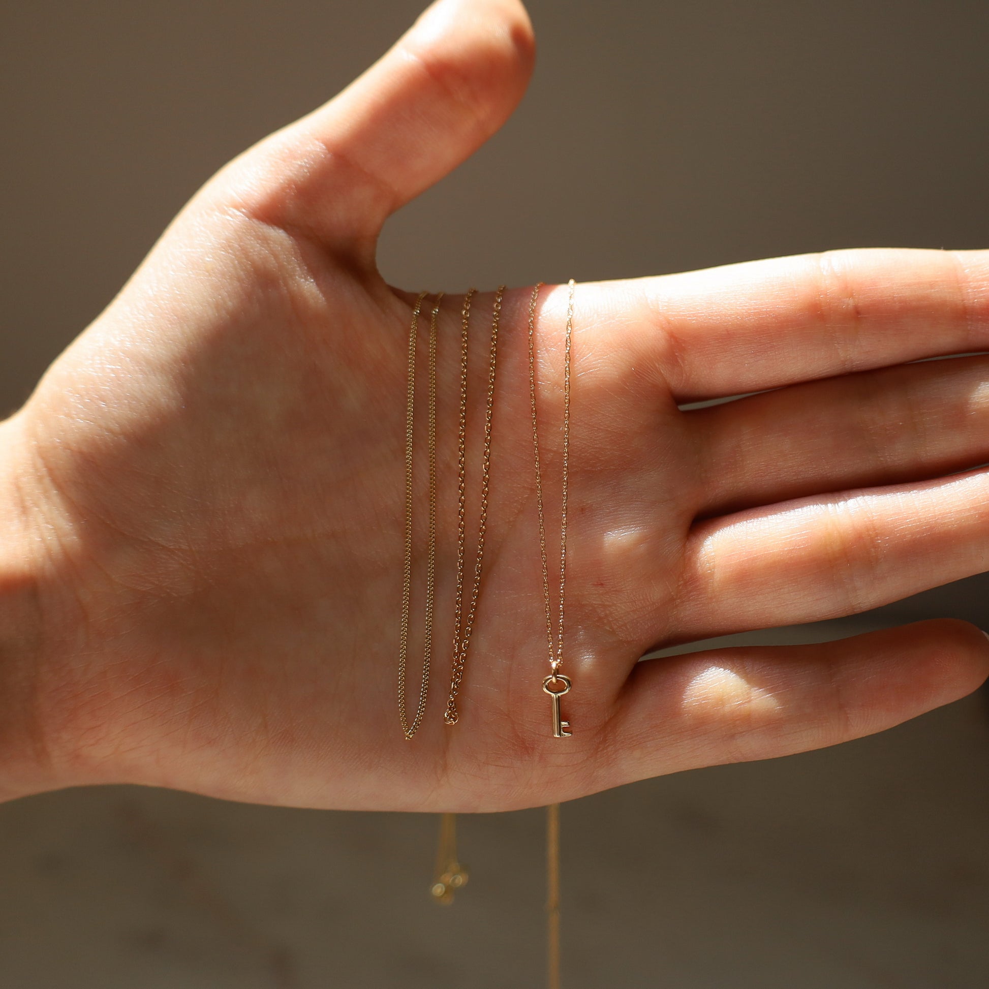 I bought the 14k 16” gold curb chain necklace with the small key pendent as a gift for my daughter’s 8th grade graduation. It was perfect: small, dainty with a sparkly chain. She and I loved it. The key is very small but it works on my petite daughter.