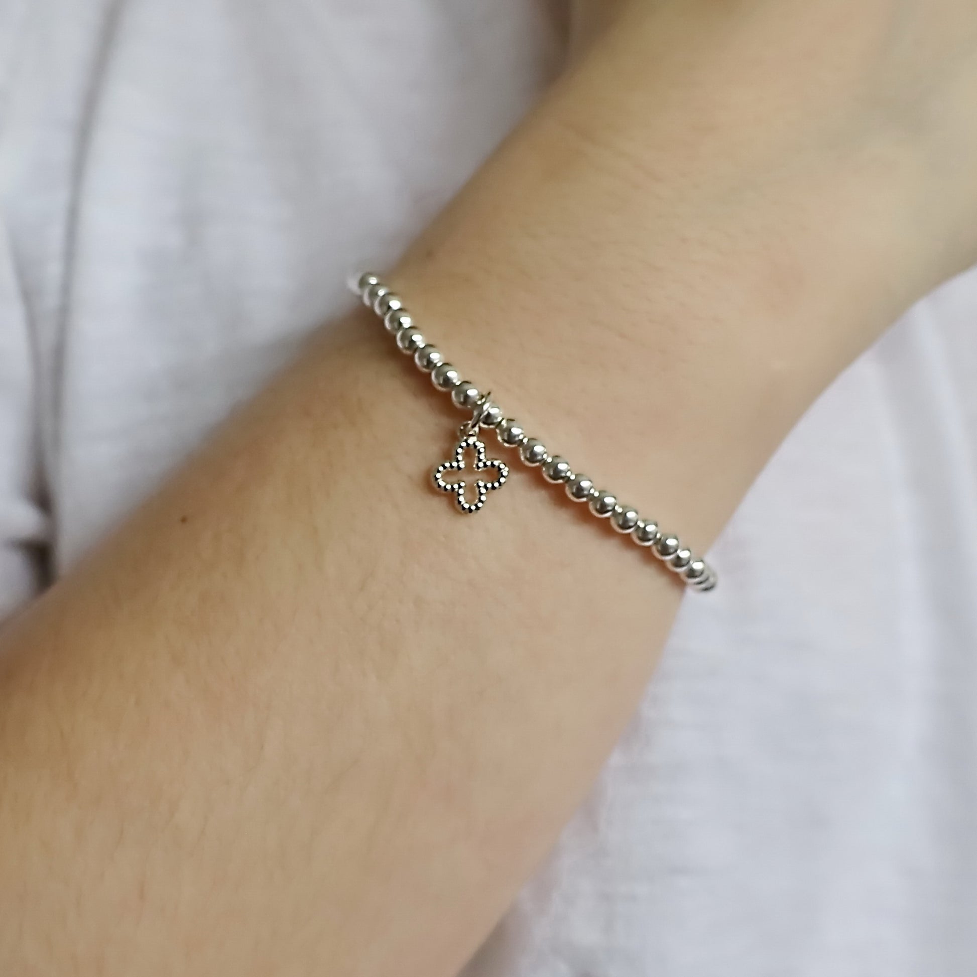 ◦ 4mm Sterling Silver Beaded Bracelet with 11.8mm x 9.8mm 4 Leaf Clover Charm