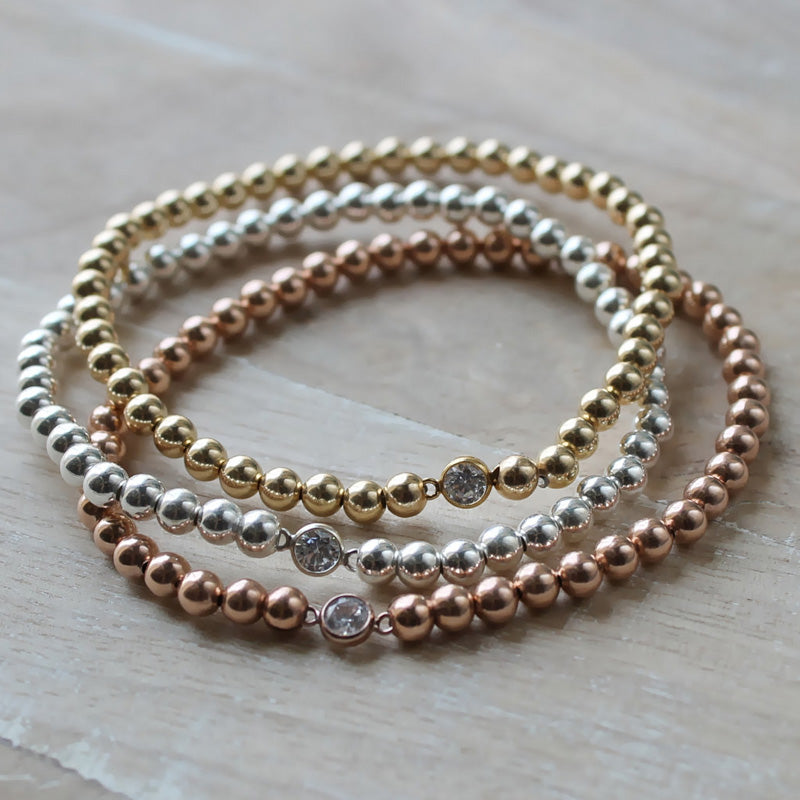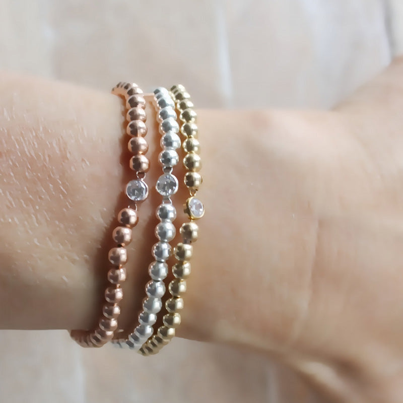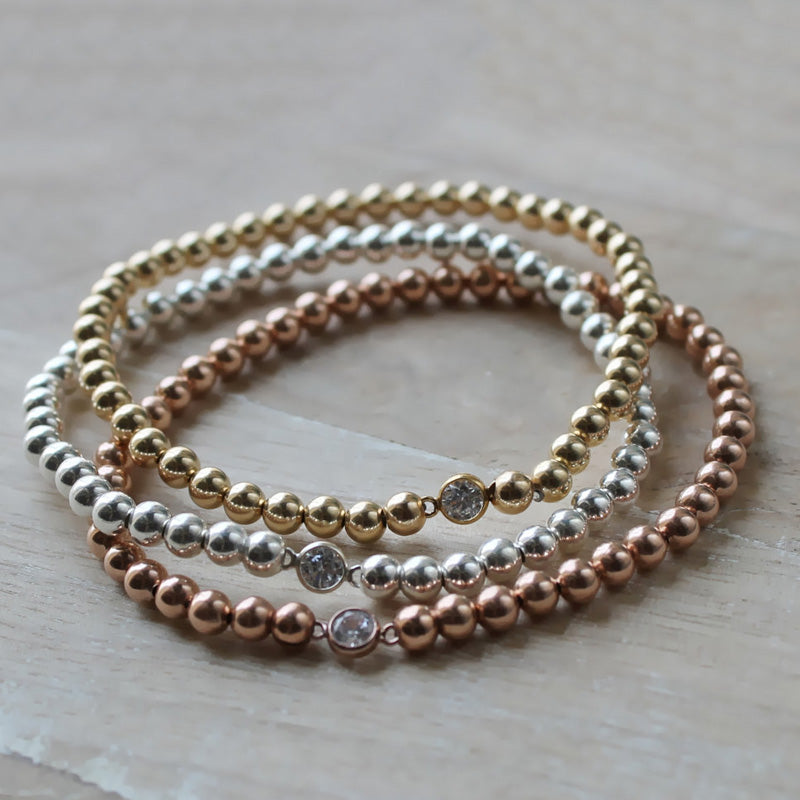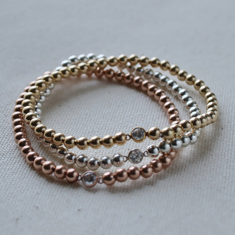 Our classic beaded bracelet with an elegant twist - a cubic zirconia to add just a touch of sparkle. Available in 14k gold filled, 14k rose gold filled, or sterling silver. Made with stretch cord.