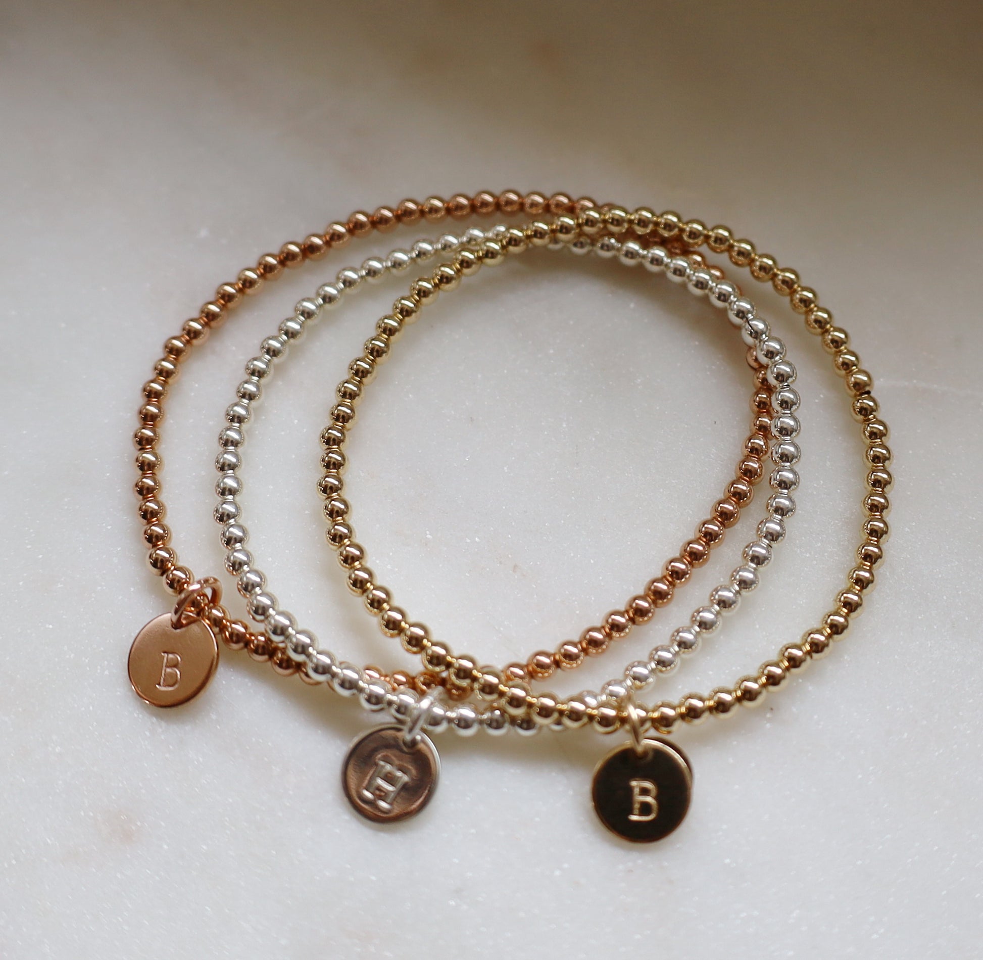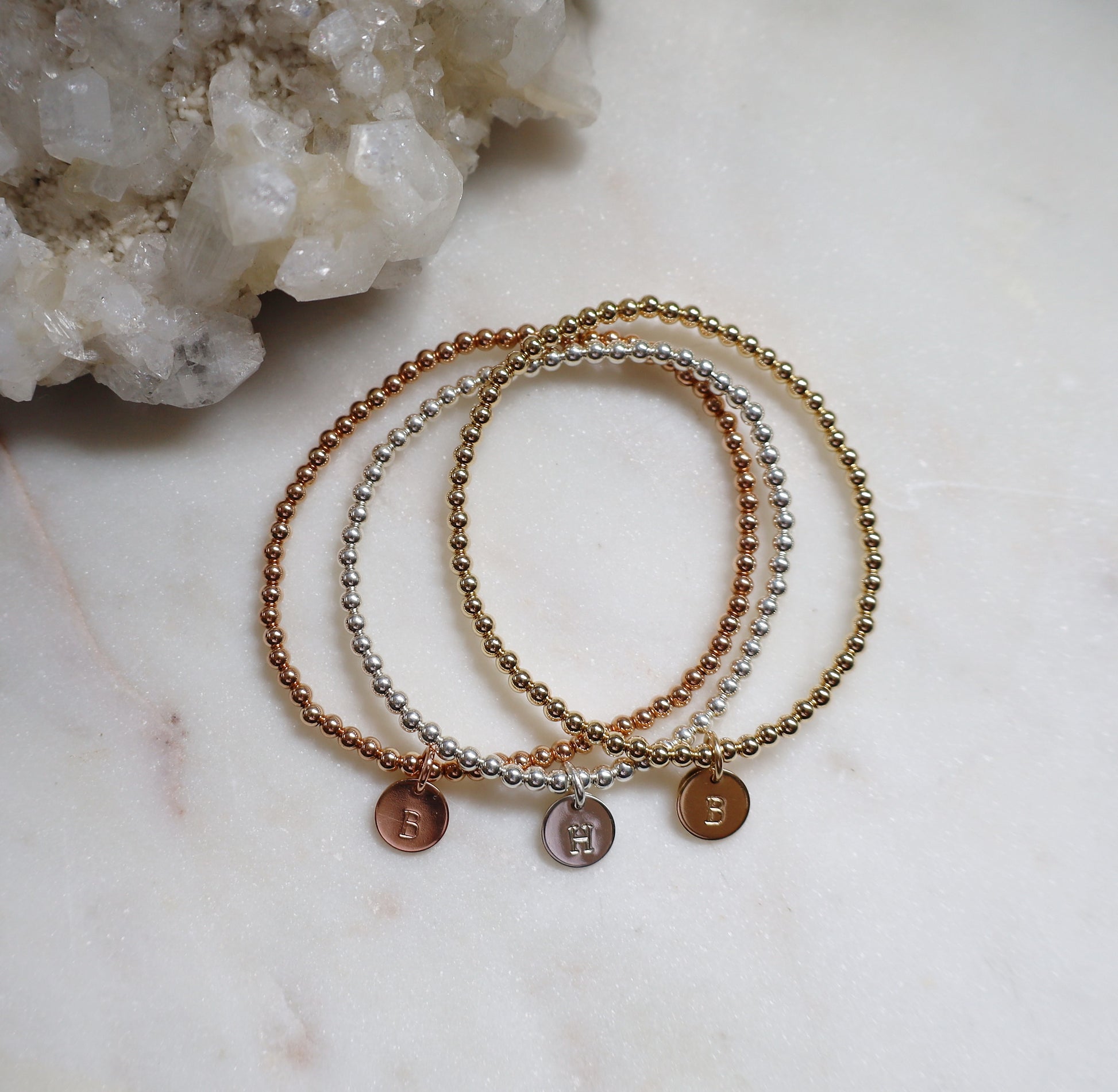 Gift your loved one this custom beaded bracelet that comes with a personalized initial disc. This piece is perfect for layering with other beaded stackable bracelets in our collection.