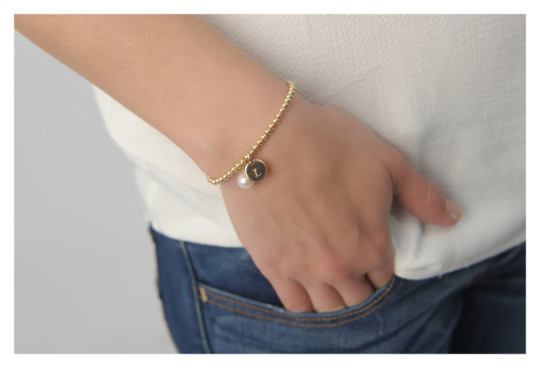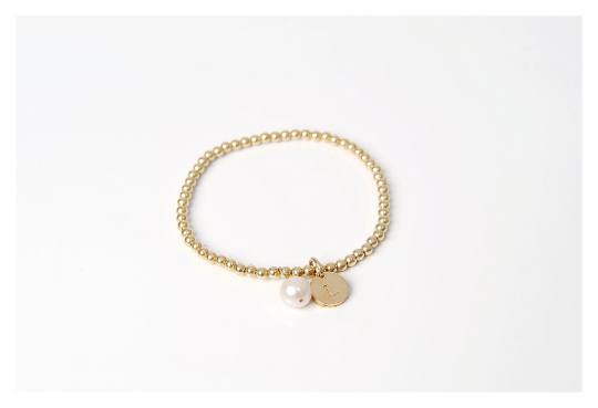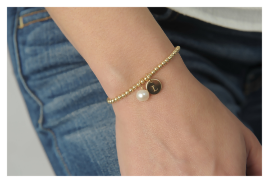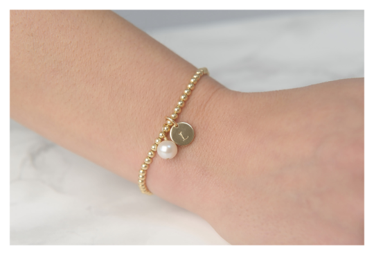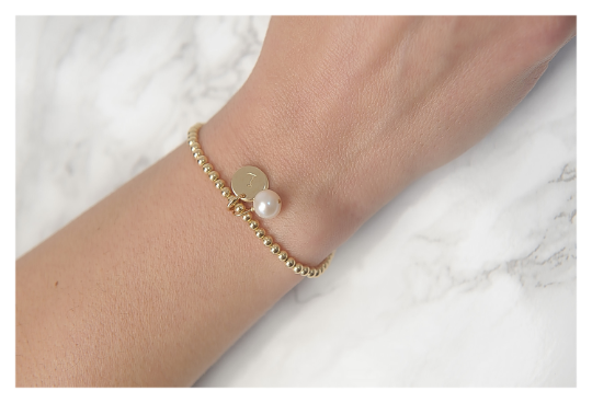This 14K gold fill bracelet comes with a freshwater pearl. You can also add a customized initial disc if you wish as well. A dainty piece you'll wear again and again!