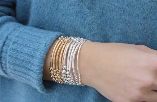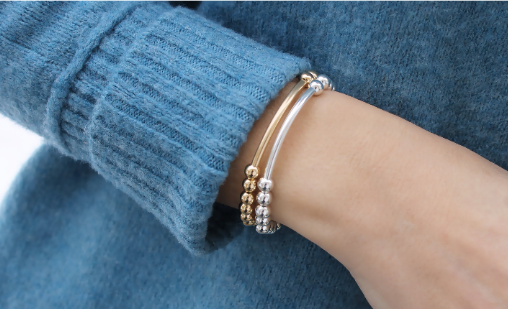 Made with stretch cord. There is not clasp with these bracelets. Beautiful stackable bracelets, Elegant, modern piece. Made from 100% 14k Gold Filled and Sterling Silver materials. It will not tarnish and you can shower with them.