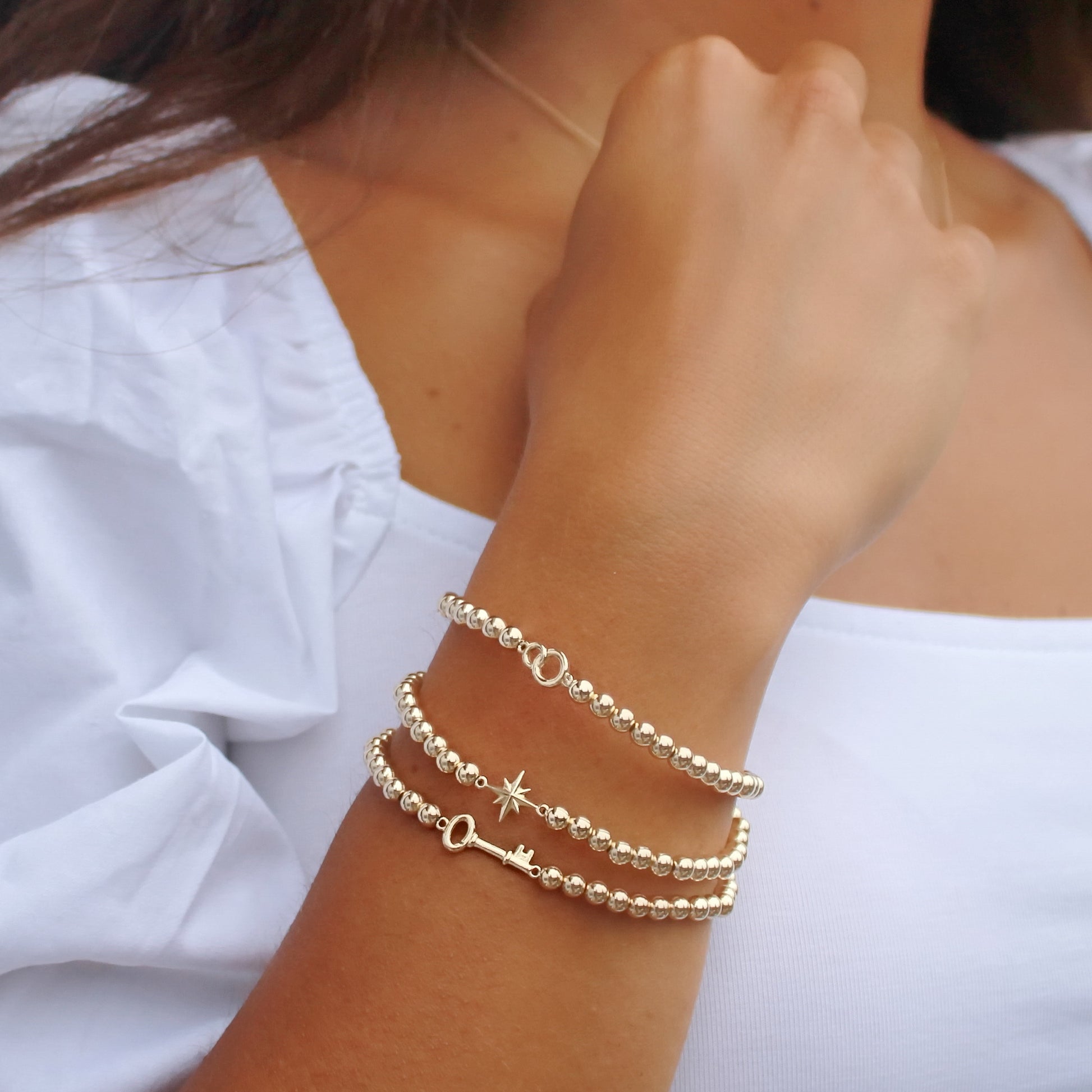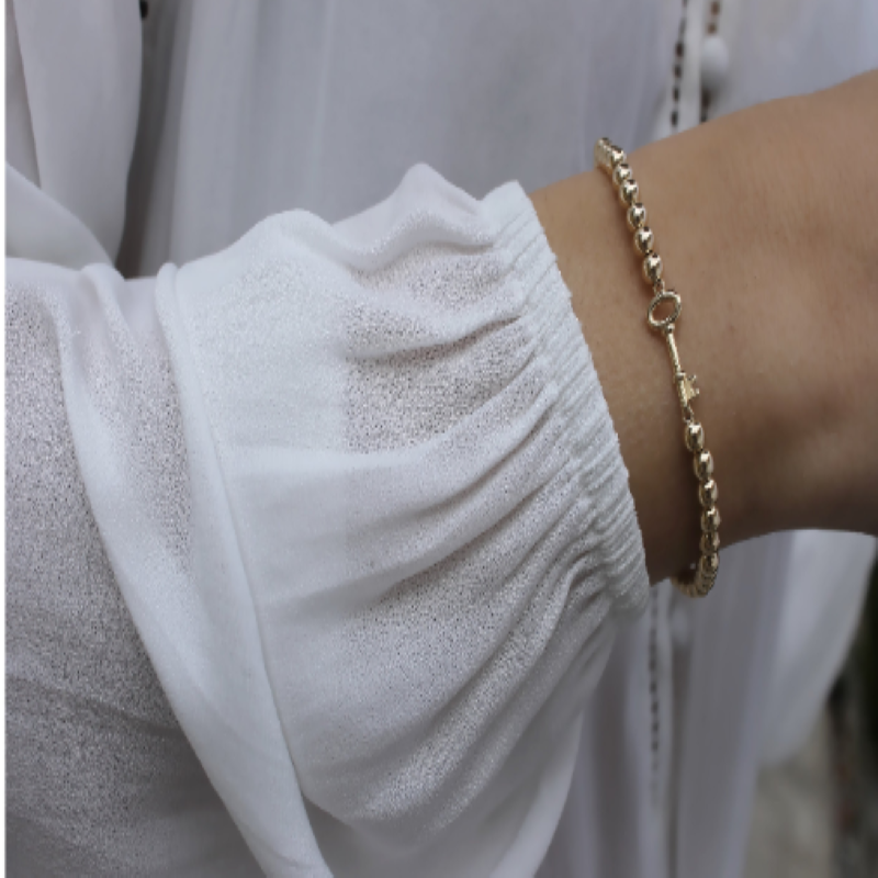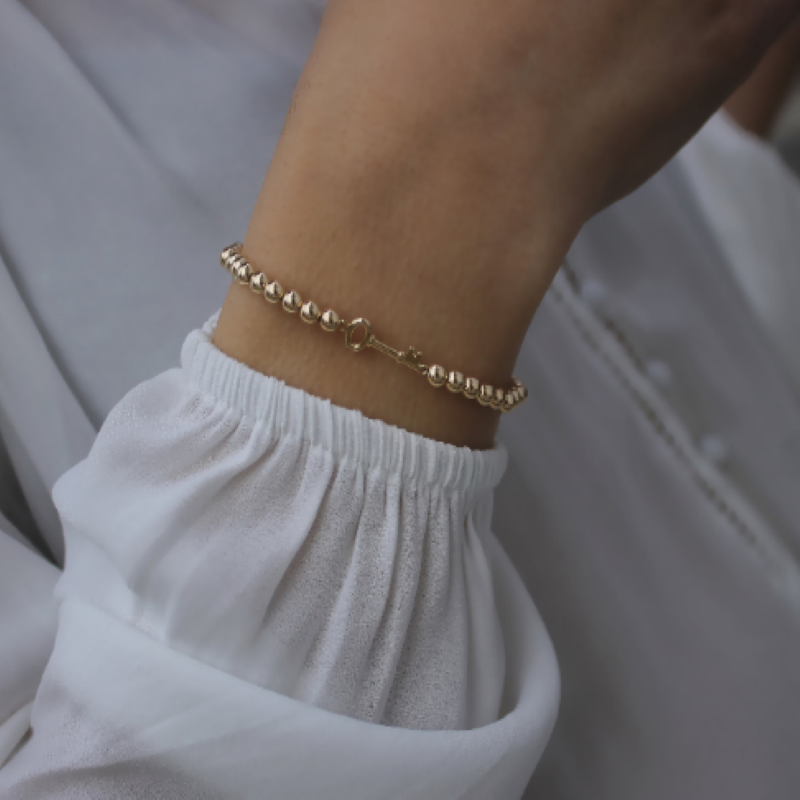 A Solid 14K Gold elegant and chic beaded bracelet. All components are made of 14K Gold including the Key.